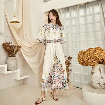 Video video posed long skirt autumn new palace aristocratic temperament lantern sleeve with waist print dress
